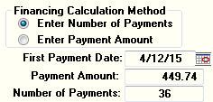 •FINANCING CALCULATION METHOD – There are two options for determining the financing for a deal. You can select to enter either a payment amount, or a number of payments. For example, if you enter a number of payments the system will calculate the payment amount. If you enter a payment amount, the system will calculate the number of payments. Once the financing is calculated, it will display the total finance charge and total of payments. For most financial institutions you will choose "number of payments" as most banks will NOT finance a deal with an odd final payment.