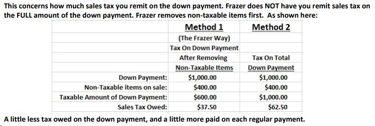 Frazer does NOT have you remit sales tax on the FULL amount of the down payment. We remove nontaxable items first. When this was first addressed by an auditor 15 years ago (Frazer started doing business in Texas in 1997) we referred the auditor to the itemization of nontaxable items on the Buyer’s Order and that was accepted as conforming to the rule. This itemization of nontaxable items on the Buyer's Order has continued to be accepted on thousands of audits since.