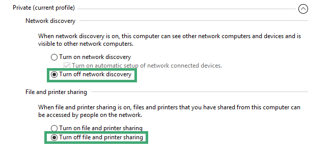 Select “Turn off network discovery” under Network Discovery and “turn off file and printer sharing“ under File and Printer Sharing. Do this under both the Private and Guest or Public drop down.
